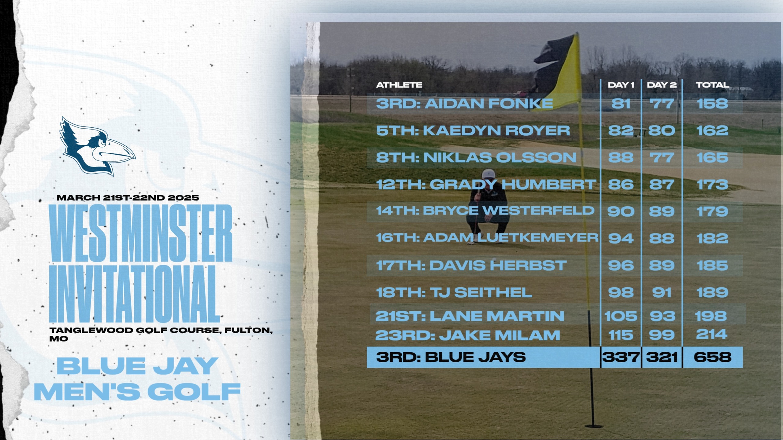 Fulton, MO 4/1/2025- The Westminster College men's golf team competed in the 2025 William Woods Invite on Monday and Tuesday. The Blue Jays would shoot a 339 in round 1 and a 340 in round to finish the tournament with 679 strokes and placed 15th overall with 17 teams from around Missouri competing. Aidan Fonke would finish a team high 44th, shooting a total of 158 for the tournament. He shot a 73 on both days.